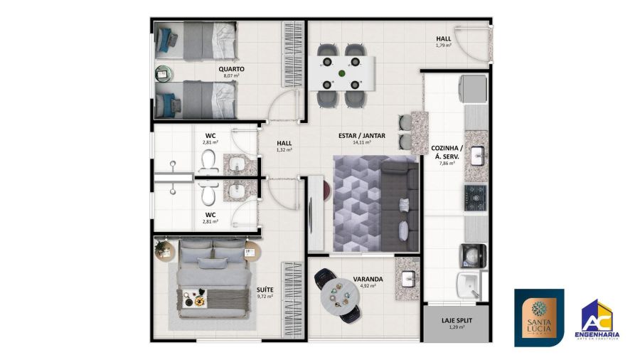 Área Total: 58 m²Área Privativa: 58 m²